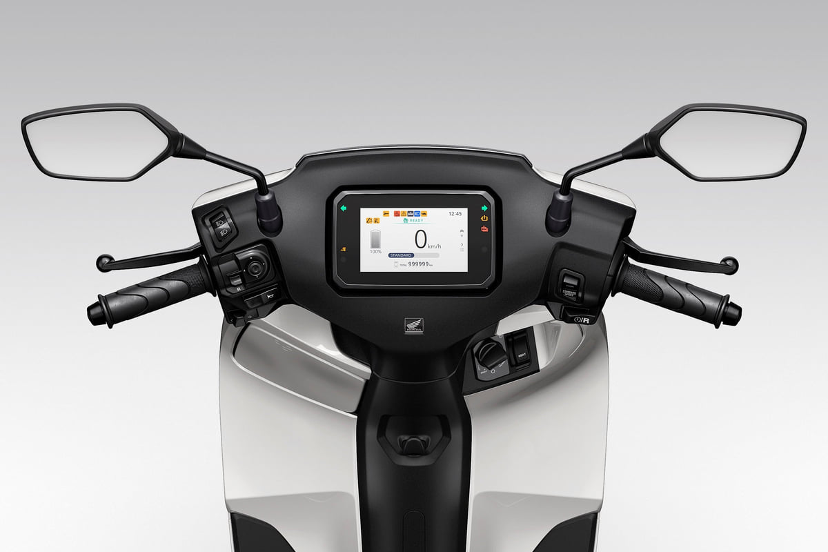 It has two swappable 48V/1.3kW batteries, which allow a range of around 70 km with a full charge (WMTC cycle). Full charging from 0 to 100% is done in 6 hours (only 3 hours from 0 to 75%).